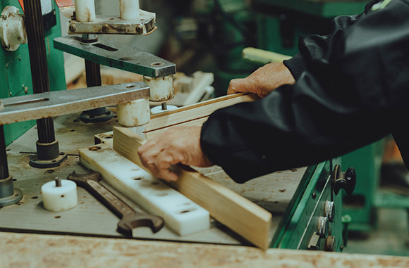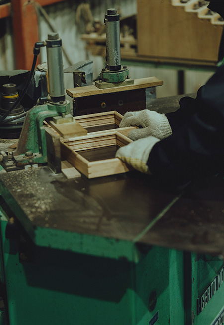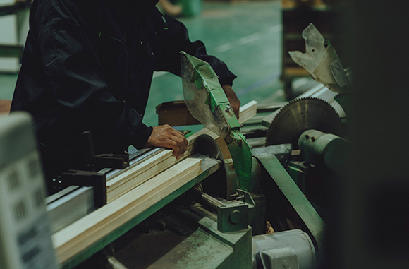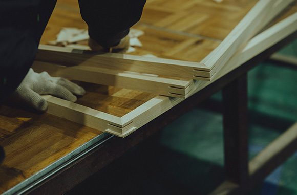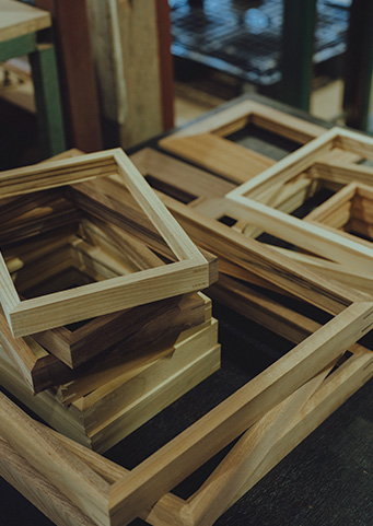 木目の方向や木の反りを見極め、人の手で一つずつ形になる木製のフレーム。写真やポスターといった作品をズレなくぴったり収めるフレームに求められるのは、コンマ数ミリという高精度の木工技術です。45度に組んだ四角の継ぎに、精巧で確かな手仕事が表れています。