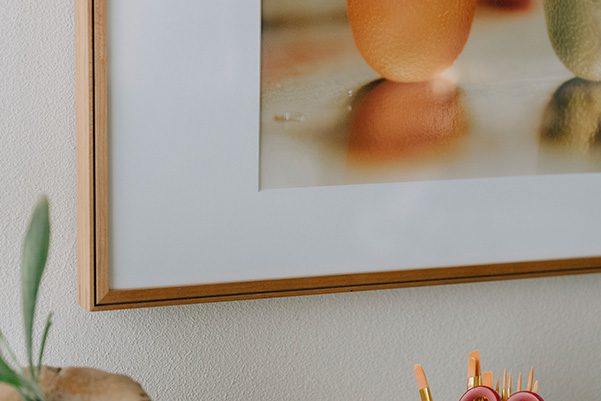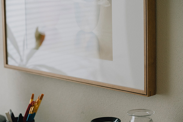 フレームはあくまで主役を飾るための「モノ」ですが、僅かな違いで見え方や印象が変わります。壁に隙間なく飾れて枠の厚みも薄く、溝の線が入る事で緊張感と存在感のバランスが良い形になったと思います。木の種類と塗装選べるので写真の雰囲気に合った制作が可能な事もありがたいです。